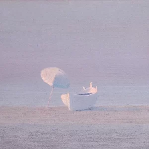 The iconographic peculiarity that distinguishes his art of the first period is the presence of deserted beaches with solitary boats, umbrellas and deckchairs, blue and white striped cabins, or motionless figures outlined, immersed in a diaphanous light.
