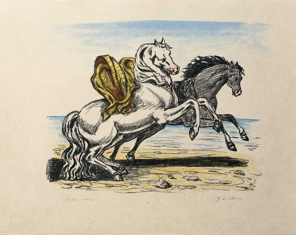 Giorgio de Chirico nasce nel 1888 a Volos in Grecia. Giovanissimo segue un corso di disegno alla Scuola politecnica di Atene, poi studia all’Accademia di Belle Arti di Monaco. Dal 1910, le letture di Nietzsche lo spingono a produrre i primi autoritratti e paesaggi metafisici. La prima personale è del 1919. Gli artisti surrealisti sono molto sensibili alla sua pittura metafisica che prefigura quella del loro movimento. De Chirico crea un’opera in cui emerge un clima di nostalgico mistero. Negli anni ’20, l’artista utilizza una fattura più classica e delle tecniche riprese dagli antichi maestri (velature, tempere). Tra il 1924 ed il 1929 vive nuovamente a Parigi dove raggiunge il movimento del Novecento in netta opposizione al modernismo. Viene criticato per questa sua scelta e molte delle sue relazioni artistiche gli girano le spalle. Esplora il tema del doppio nelle tele in cui si mette in scena a fianco della madre, del fratello o di specchi. Dipinge anche personaggi della mitologia greca, ritratti, cavalli, compone nature morte che definisce “vite silenziose”. De Chirico si compiace nel confondere le carte della propria arte, creando intorno a sé l’enigma che lo contraddistinguerà. Lo si critica di imitare sé stesso. Illustra diverse opere (Apollinaire, Cocteau, Eluard),concepisce decori e costumi per l’opera, scrive romanzi e prose corte. Artisti come Ernst, Tanguy, Dali o Magritte hanno sottolineato l’influenza che egli ha saputo esercitare su di loro. Muore nel 1978 a Roma.