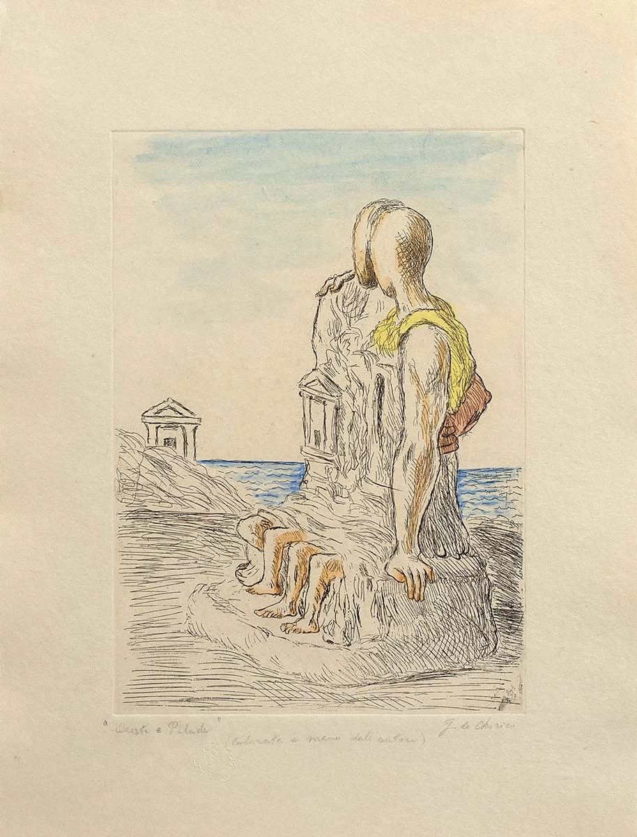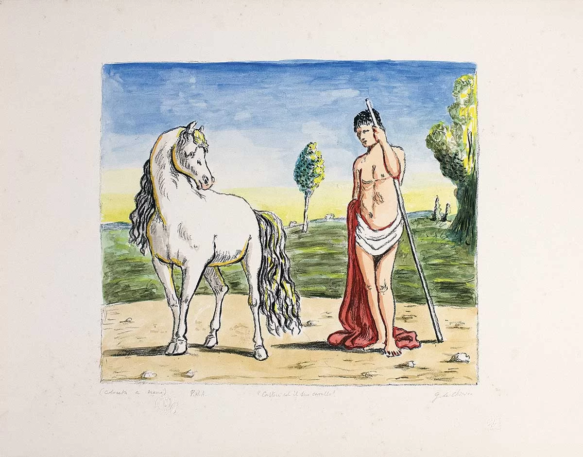 Giorgio de Chirico nasce nel 1888 a Volos in Grecia. Giovanissimo segue un corso di disegno alla Scuola politecnica di Atene, poi studia all’Accademia di Belle Arti di Monaco. Dal 1910, le letture di Nietzsche lo spingono a produrre i primi autoritratti e paesaggi metafisici. La prima personale è del 1919. Gli artisti surrealisti sono molto sensibili alla sua pittura metafisica che prefigura quella del loro movimento. De Chirico crea un’opera in cui emerge un clima di nostalgico mistero. Negli anni ’20, l’artista utilizza una fattura più classica e delle tecniche riprese dagli antichi maestri (velature, tempere). Tra il 1924 ed il 1929 vive nuovamente a Parigi dove raggiunge il movimento del Novecento in netta opposizione al modernismo. Viene criticato per questa sua scelta e molte delle sue relazioni artistiche gli girano le spalle. Esplora il tema del doppio nelle tele in cui si mette in scena a fianco della madre, del fratello o di specchi. Dipinge anche personaggi della mitologia greca, ritratti, cavalli, compone nature morte che definisce “vite silenziose”. De Chirico si compiace nel confondere le carte della propria arte, creando intorno a sé l’enigma che lo contraddistinguerà. Lo si critica di imitare sé stesso. Illustra diverse opere (Apollinaire, Cocteau, Eluard),concepisce decori e costumi per l’opera, scrive romanzi e prose corte. Artisti come Ernst, Tanguy, Dali o Magritte hanno sottolineato l’influenza che egli ha saputo esercitare su di loro. Muore nel 1978 a Roma.