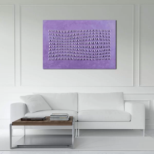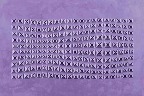 Tutto è in un vortice perfettamente concatenato. Rifrazioni chiare e scure, giochi di luce ed ombre si sposano sulle superfici monocromatiche, creando un virtuosismo ottico dall’effetto ipnotico e cinetico. Un lavoro manuale meticoloso, analitico, dà forma ad un complesso sistema di fessure e pieghe, il cui principio esecutivo è dettato dall’estremo rigore compositivo che restituisce purezza e semplicità lineare. A seconda dell’angolazione prospettica, subordinata sia all’incidenza della luce sulla tela, sia allo spostamento del nostro sguardo, primo piano e sfondo si intersecano, nascondendo e svelando differenti visioni.