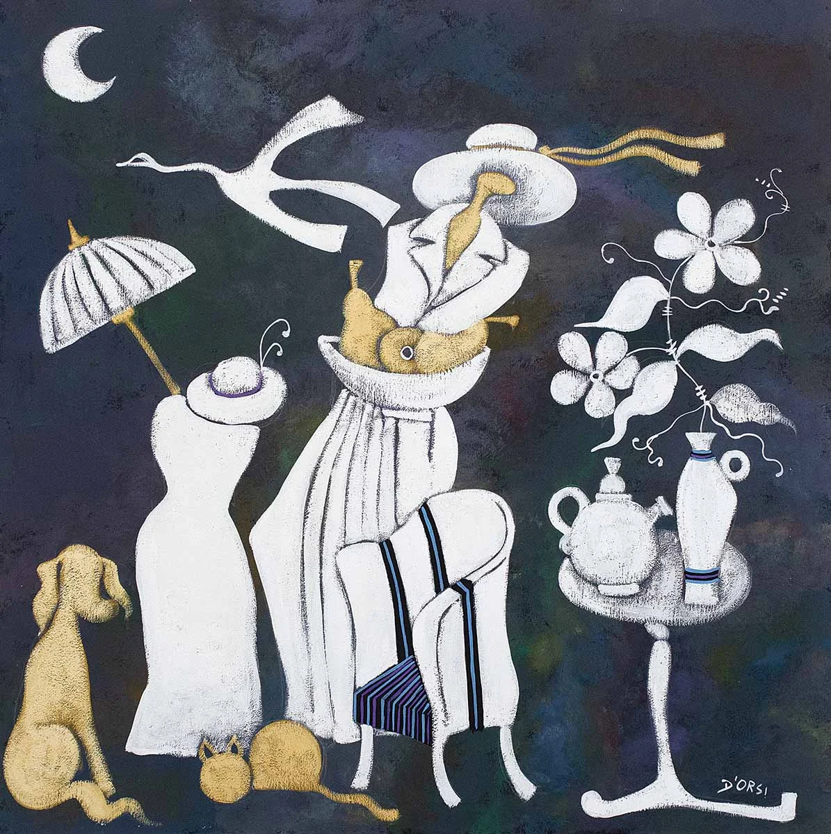 Poliedrico ed estroverso, il pittore varia nella scelta dei soggetti. Le figure che abitano i suoi quadri sembrano manichini, riportando così alla memoria l’insegnamento di De Chirico rivisitato dall’estro dell’artista. I paesaggi si suddividono in ordinati moduli geometrici, appartenenti a un mondo ideale, liberi dalla presenza umana, mentre gli alberi, anch’essi protagonisti di alcune opere di Dorsi, sono costruiti seguendo un astratto impianto segnico, capace di suscitare profonde vibrazioni nello spirito.