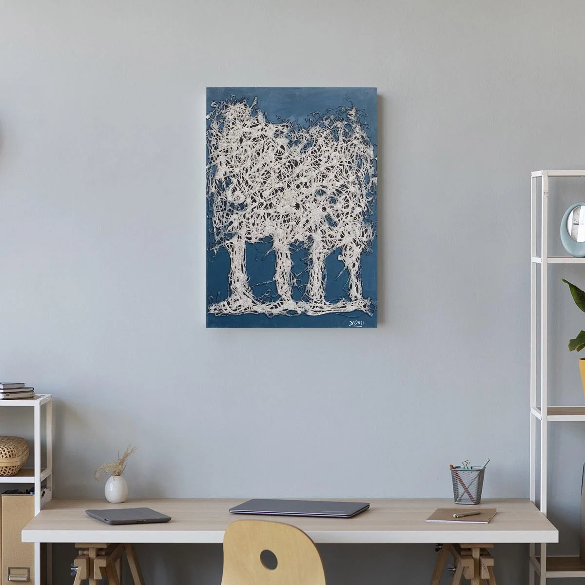 Poliedrico ed estroverso, il pittore varia nella scelta dei soggetti. Le figure che abitano i suoi quadri sembrano manichini, riportando così alla memoria l’insegnamento di De Chirico rivisitato dall’estro dell’artista. I paesaggi si suddividono in ordinati moduli geometrici, appartenenti a un mondo ideale, liberi dalla presenza umana, mentre gli alberi, anch’essi protagonisti di alcune opere di Dorsi, sono costruiti seguendo un astratto impianto segnico, capace di suscitare profonde vibrazioni nello spirito.