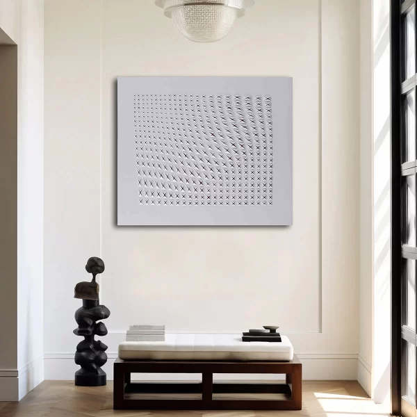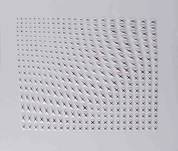 Tutto è in un vortice perfettamente concatenato. Rifrazioni chiare e scure, giochi di luce ed ombre si sposano sulle superfici monocromatiche, creando un virtuosismo ottico dall’effetto ipnotico e cinetico. Un lavoro manuale meticoloso, analitico, dà forma ad un complesso sistema di fessure e pieghe, il cui principio esecutivo è dettato dall’estremo rigore compositivo che restituisce purezza e semplicità lineare. A seconda dell’angolazione prospettica, subordinata sia all’incidenza della luce sulla tela, sia allo spostamento del nostro sguardo, primo piano e sfondo si intersecano, nascondendo e svelando differenti visioni.