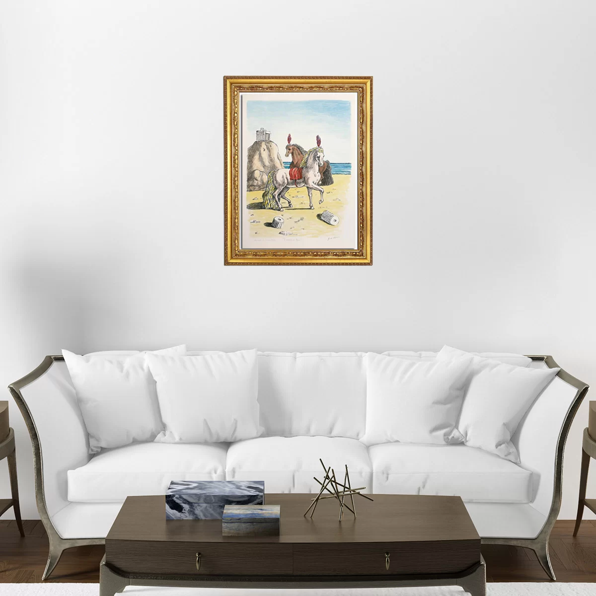 Giorgio de Chirico nasce nel 1888 a Volos in Grecia. Giovanissimo segue un corso di disegno alla Scuola politecnica di Atene, poi studia all’Accademia di Belle Arti di Monaco. Dal 1910, le letture di Nietzsche lo spingono a produrre i primi autoritratti e paesaggi metafisici. La prima personale è del 1919. Gli artisti surrealisti sono molto sensibili alla sua pittura metafisica che prefigura quella del loro movimento. De Chirico crea un’opera in cui emerge un clima di nostalgico mistero. Negli anni ’20, l’artista utilizza una fattura più classica e delle tecniche riprese dagli antichi maestri (velature, tempere). Tra il 1924 ed il 1929 vive nuovamente a Parigi dove raggiunge il movimento del Novecento in netta opposizione al modernismo. Viene criticato per questa sua scelta e molte delle sue relazioni artistiche gli girano le spalle. Esplora il tema del doppio nelle tele in cui si mette in scena a fianco della madre, del fratello o di specchi. Dipinge anche personaggi della mitologia greca, ritratti, cavalli, compone nature morte che definisce “vite silenziose”. De Chirico si compiace nel confondere le carte della propria arte, creando intorno a sé l’enigma che lo contraddistinguerà. Lo si critica di imitare sé stesso. Illustra diverse opere (Apollinaire, Cocteau, Eluard),concepisce decori e costumi per l’opera, scrive romanzi e prose corte. Artisti come Ernst, Tanguy, Dali o Magritte hanno sottolineato l’influenza che egli ha saputo esercitare su di loro. Muore nel 1978 a Roma.