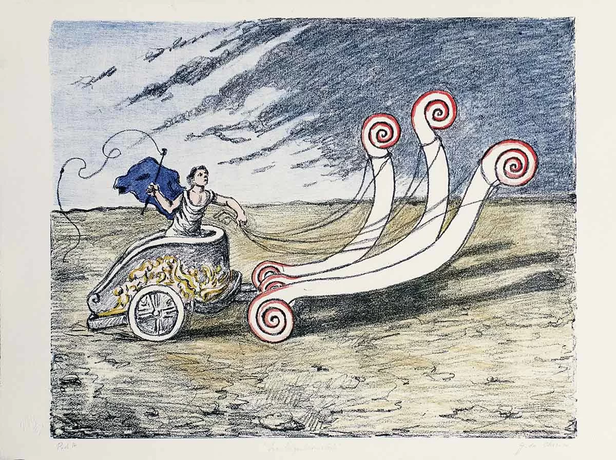 Giorgio de Chirico nasce nel 1888 a Volos in Grecia. Giovanissimo segue un corso di disegno alla Scuola politecnica di Atene, poi studia all’Accademia di Belle Arti di Monaco. Dal 1910, le letture di Nietzsche lo spingono a produrre i primi autoritratti e paesaggi metafisici. La prima personale è del 1919. Gli artisti surrealisti sono molto sensibili alla sua pittura metafisica che prefigura quella del loro movimento.