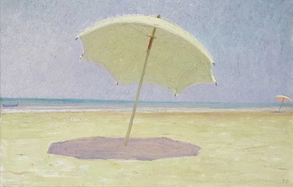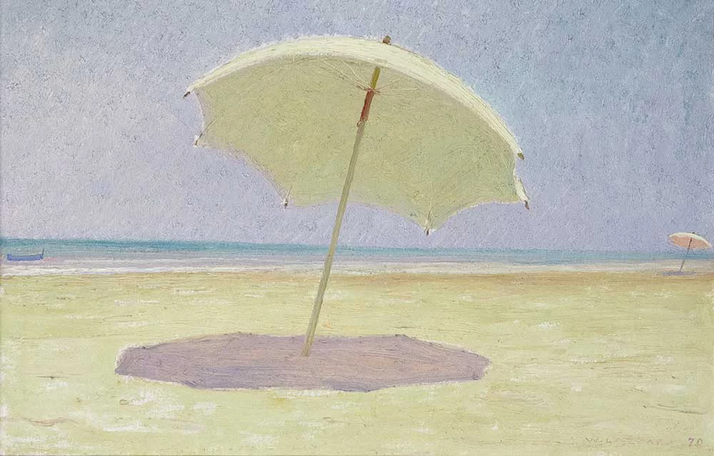 Walter Lazzaro (Roma 1914 – Milano 1989) è un pittore e attore italiano. La sua formazione avviene a Roma al Liceo Artistico e all’Accademiadi Belle Arti di Roma. Dal 1935 diventa docente di Pittura al Liceo Artistico di Roma e alle accademie di Belle Arti di Roma, Carrara, Bologna,Milano-Brera. La peculiarità iconografia che contraddistingue la sua arte del primo periodo è la presenza di deserte spiagge con solitarie barche, ombrelloni e sdraio, cabine a strisce bianche e blu, o figure immobili accennate, immersi in una luce diafana.