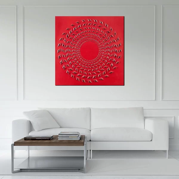Tutto è in un vortice perfettamente concatenato. Rifrazioni chiare e scure, giochi di luce ed ombre si sposano sulle superfici monocromatiche, creando un virtuosismo ottico dall’effetto ipnotico e cinetico. Un lavoro manuale meticoloso, analitico, dà forma ad un complesso sistema di fessure e pieghe, il cui principio esecutivo è dettato dall’estremo rigore compositivo che restituisce purezza e semplicità lineare. A seconda dell’angolazione prospettica, subordinata sia all’incidenza della luce sulla tela, sia allo spostamento del nostro sguardo, primo piano e sfondo si intersecano, nascondendo e svelando differenti visioni.